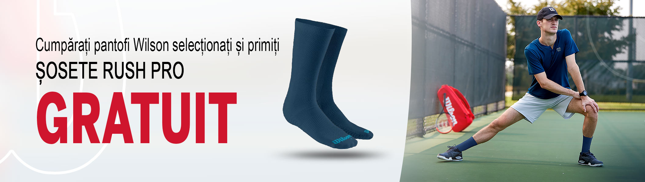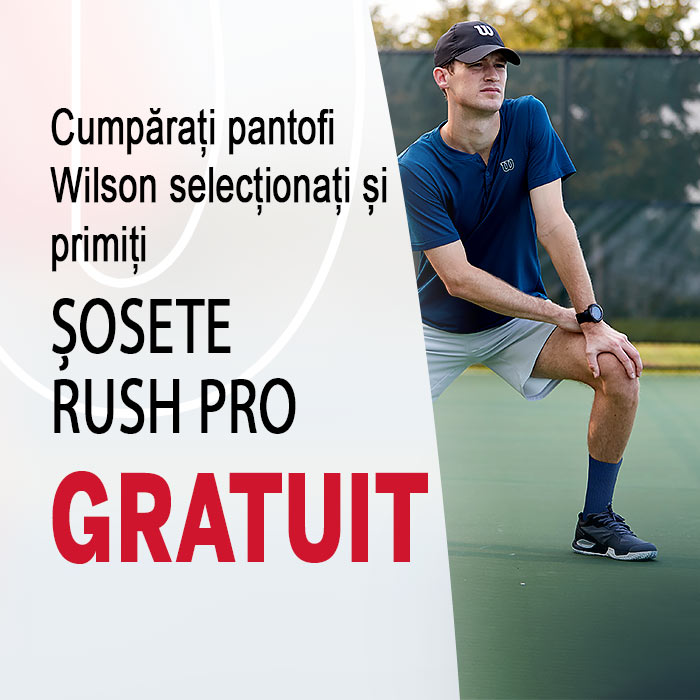 Dacă doriți să profitați de această promoție, adăugați pantofii Wilson selectați în coșul de cumpărături. Accesați coșul de cumpărături și apoi selectați dimensiunea șosetelor gratuite pe care doriți să le primiți. Confirmați alegerea și apoi finalizați cumpărăturile. Această ofertă este valabilă în limita stocului disponibil sau până la 28.02.2022. Neadăugarea de șosete în timpul cumpărăturilor echivalează cu declinarea din partea dvs. a promoției Șosete.